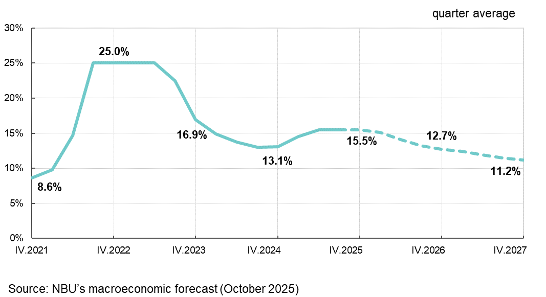 The NBU does not commit to adhere to a published trajectory of the key policy rate. It is just a forecast. If necessary, the NBU Board can approve a decision that may result in the key policy rate deviating from its expected trajectory. Such decisions may be driven by changes in the assessed balance of risks to the NBU’s goals, primarily its inflation target, as well as by the emergence of domestic and external factors that were not included in the macroeconomic forecast and that may cause its main indicators to stray from their anticipated paths.